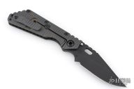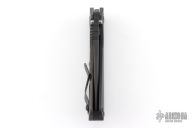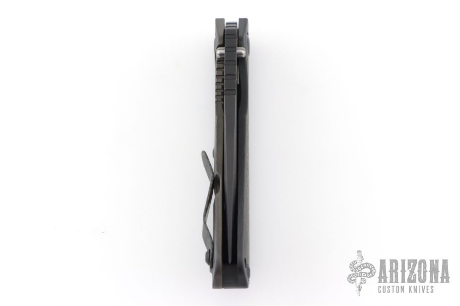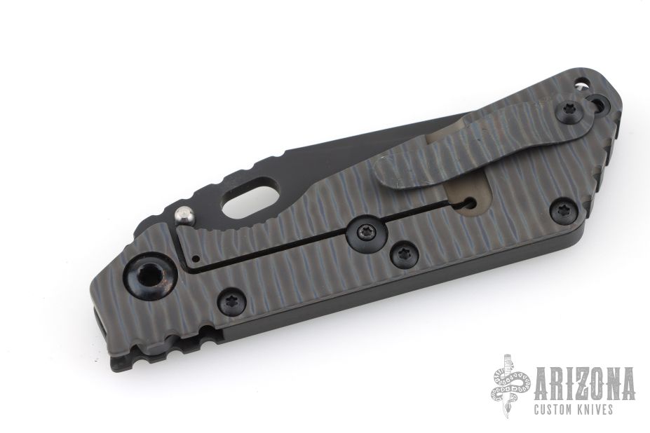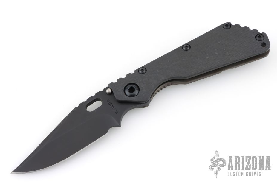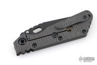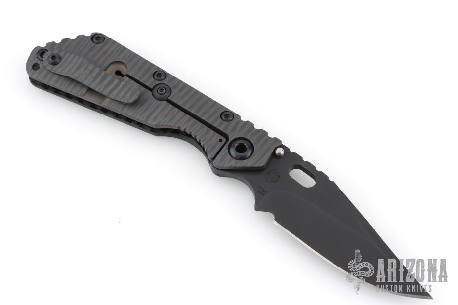 This Mick Strider SMF CC framelock folder features a black Bowie blade with thumbhole and notched thumbrest. The handle has a carbon fiber and flamed titanium frame with titanium clip, tip up carry, lockbar stabilizer. Jimping on blade spine. Nice lockup, detent, and blade seating. Excellent condition.