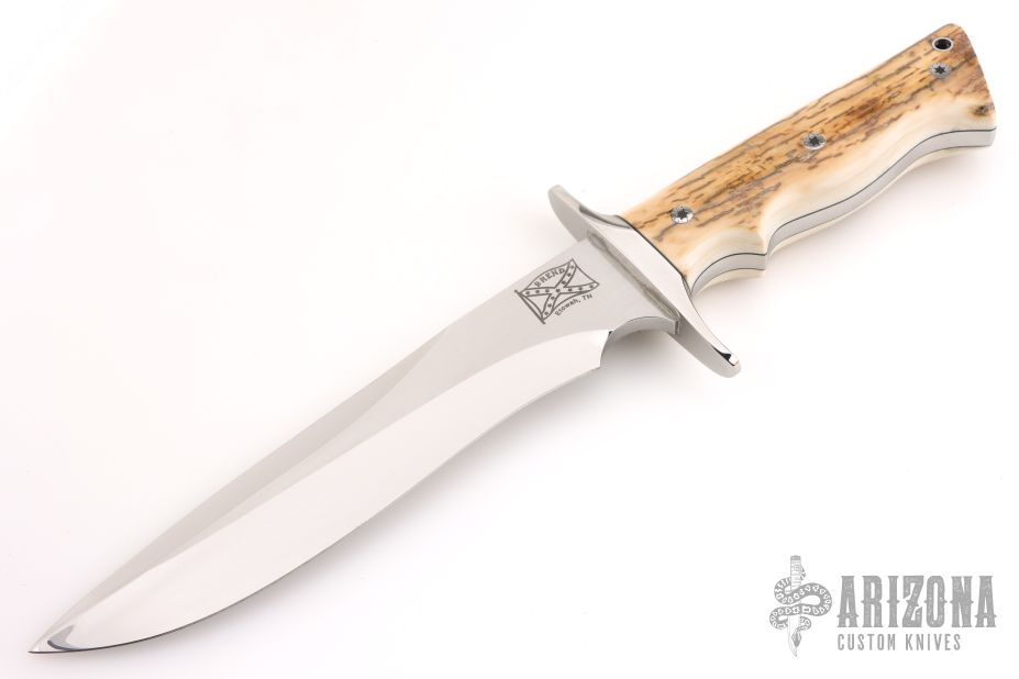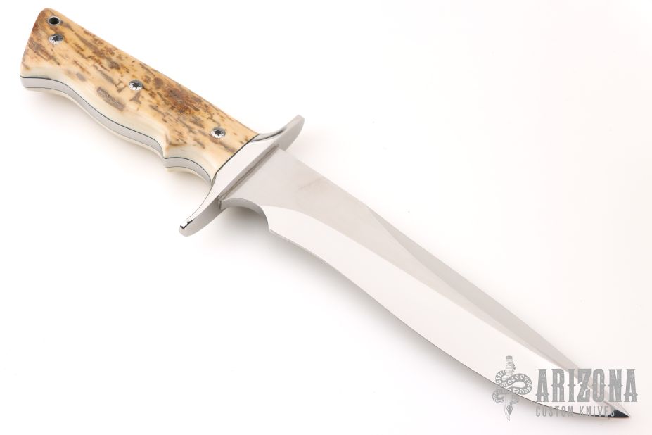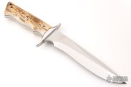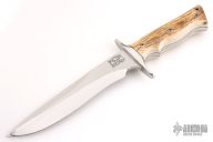 This Model 2 by Walter Brend features a double hollow ground blade with hand-rubbed satin finished flats and mirror polished grinds, and a 4" sharpened top edge, .272" blade stock and 1.527" blade depth, full tang construction. The handle has a mirror finished stainless steel double guard, and beautiful mammoth ivory scales with black liners/spacers, mosaic pins and lanyard hole. Comes with a zippered case. This knife is beautiful and sports the "Etowah TN" logo.