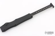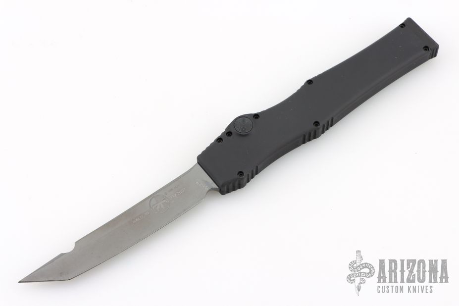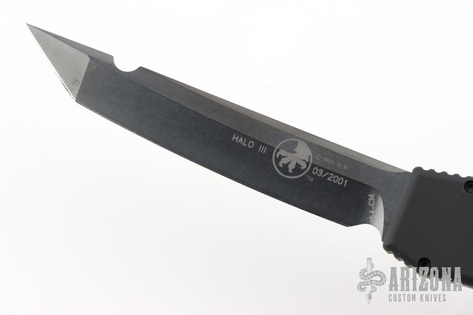 This Halo III has a two-tone black/satin blade and is dated 03/2001. Black body, hardware, and sterile charging handle. Comes with original box, papers, and period correct Microtech nylon belt sheath. Listing also includes a signed letter from Tony stating this knife is part of a limited edition run of 112. Excellent condition.