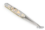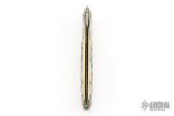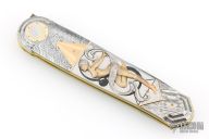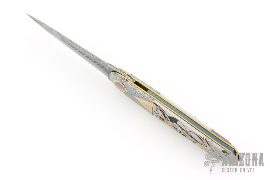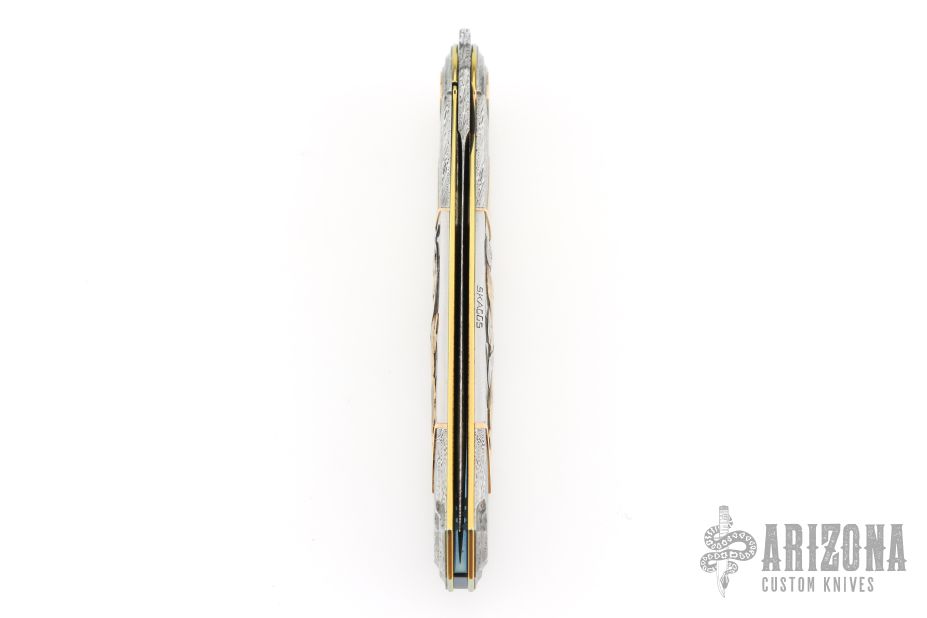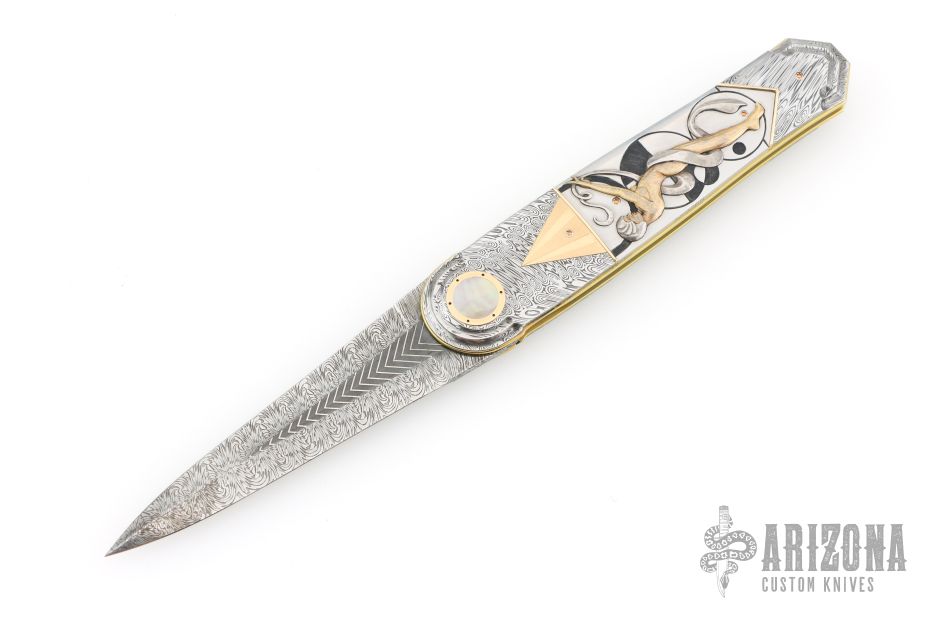 This Art Deco Linerlock Folder by Owen Wood features a multi-bar Damascus blade with false top edge, .085" blade thickness. The handle has Damascus bolsters, gold pivot with black lip pearl inlay, two-tone gold inlays on bolsters, Ron Skaggs engraved and overlaid inlay, anodized titanium liners, two-tone blued steel backspacer. The handle is .414" thick at the widest part and .886" tall at the pivot area. Comes with a zippered case. Excellent condition.