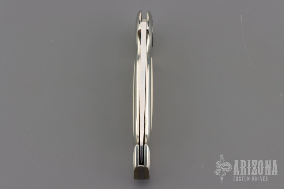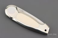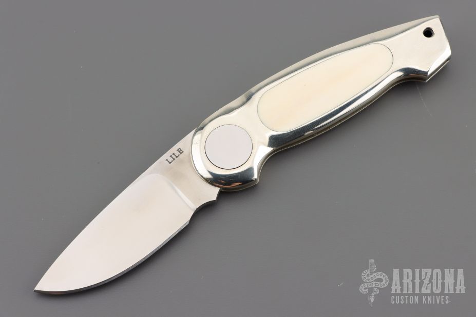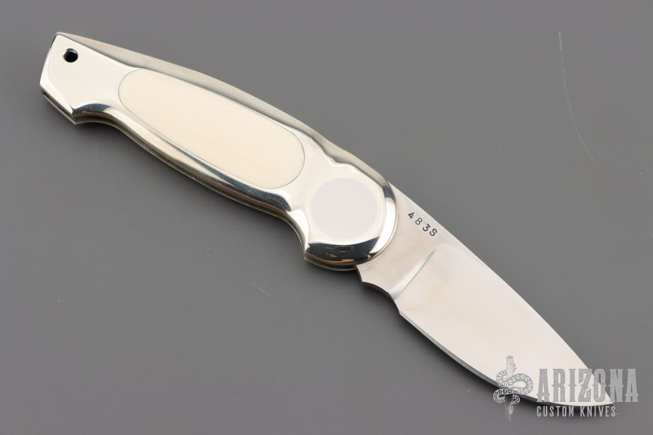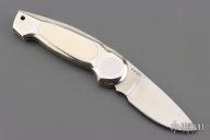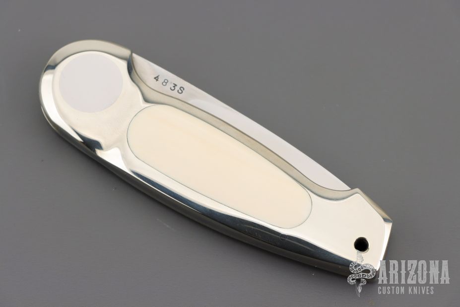 This Button Lock Folder from Jimmy Lile features a satin finished blade with nail nick, #483S on blade. The handle has a nickel silver frame with mammoth ivory inlays. Large button lock release mechanism used to open and close the knife. Dated "1987 U.S. PAT# 4148140" on inside of backspacer. Excellent condition. Comes with a felt pouch and a nylon belt sheath.
