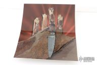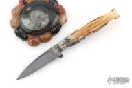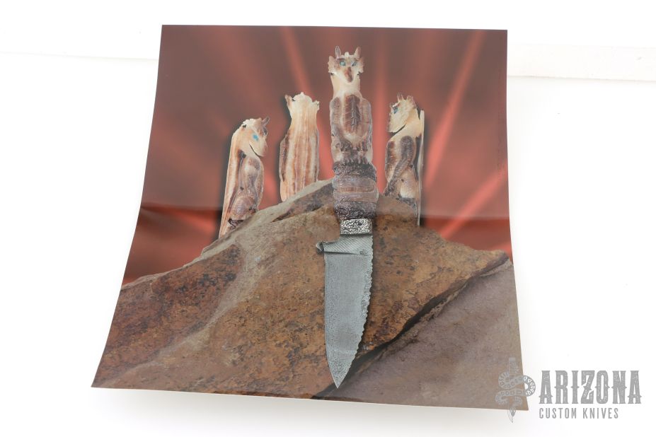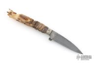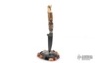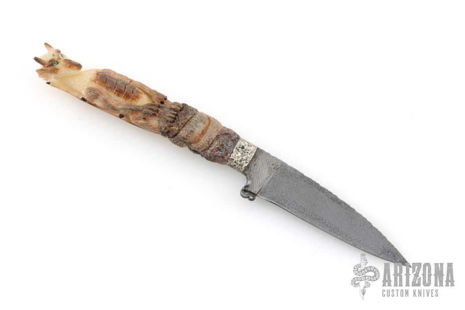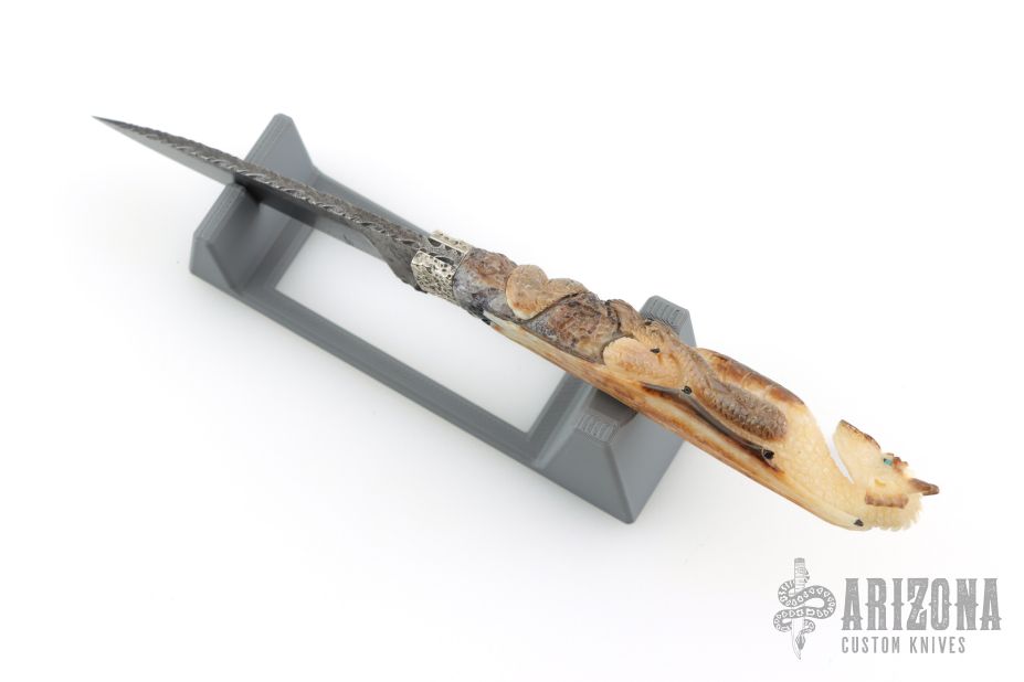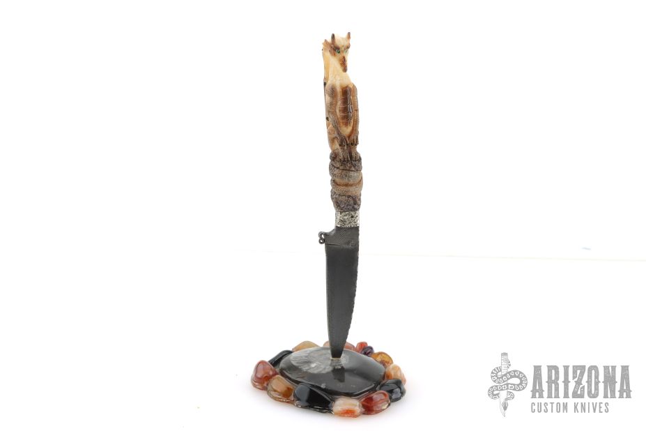 This Dragon Desk Knife by Daniel Winkler features an antique finished blade forged from a file, fileworked spine, .124" blade stock and .731" blade depth, hidden tang construction. The handle has hammered nickel silver bolsters, fossil walrus ivory grip carved with a dragon with opal eyes by Paul G Grussenmeyer. This knife was handmade by Daniel Winkler on a design of Dr. Paul Grussenmeyer who did the carving on the handle and built the stand made of stones. Comes with a zippered case. Also comes with two professional pictures of the knife and stand. Excellent condition.