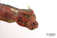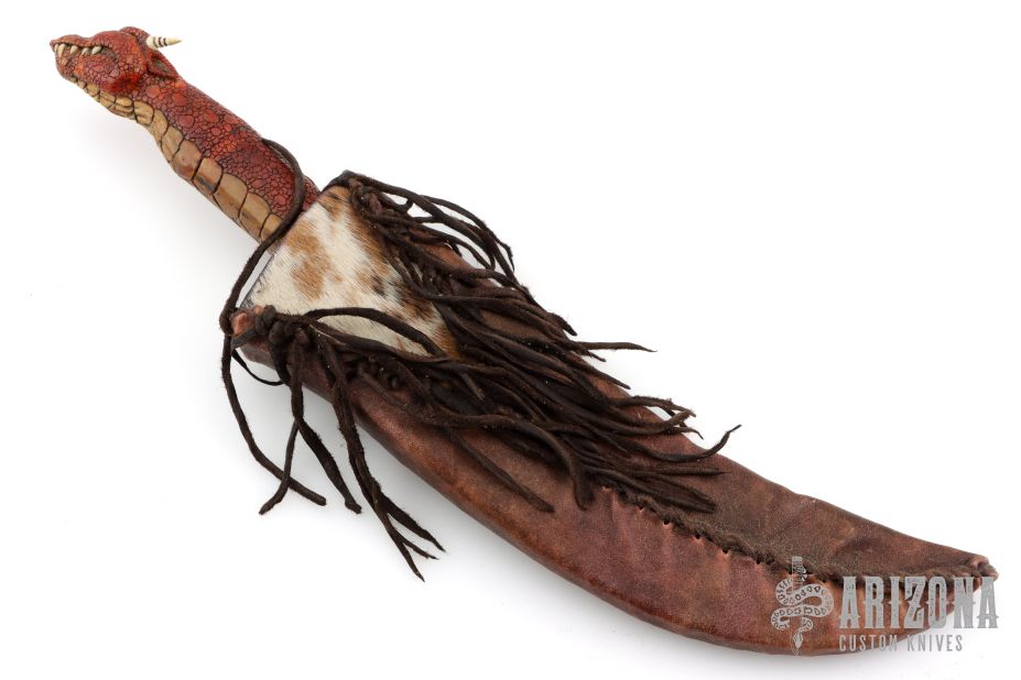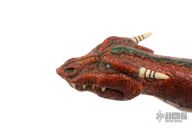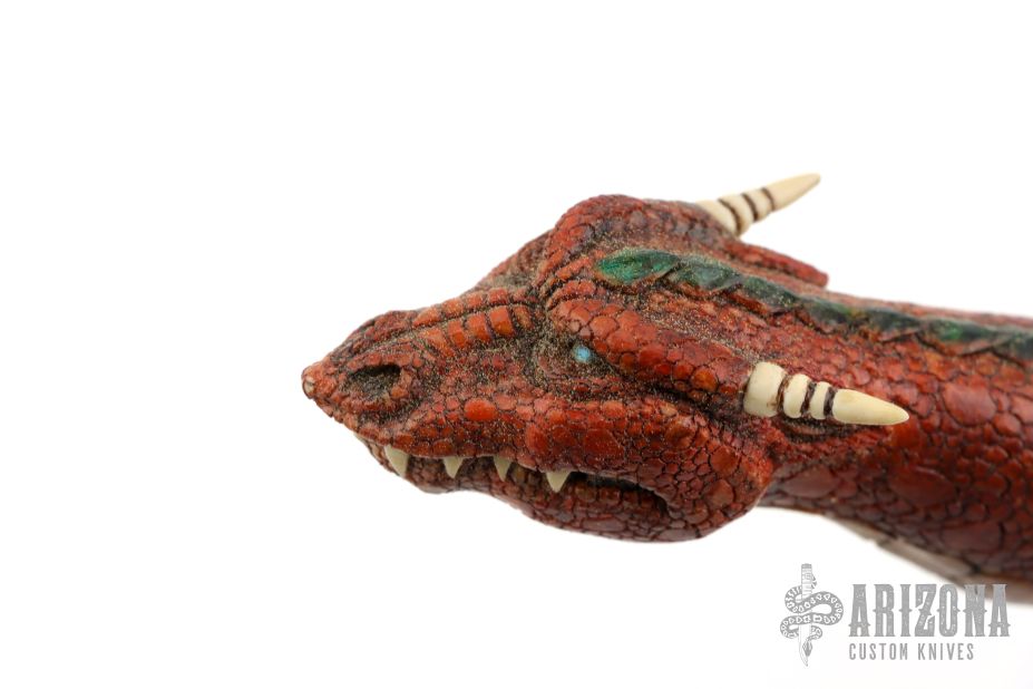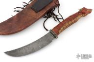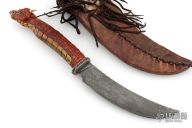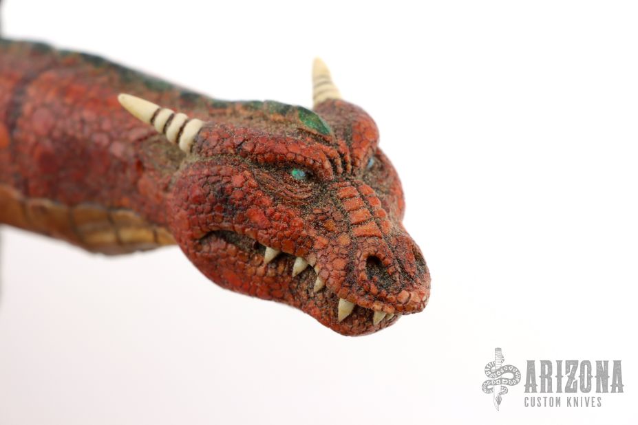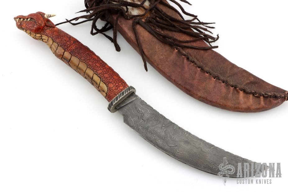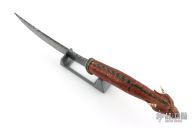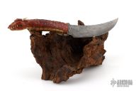 This Red Dragon Knife by Daniel Winkler features a Damascus blade with fileworked spine, .176" blade stock and 1.300" blade depth, hidden tang construction. The handle has 3-piece guard made of fileworked nickel silver and Damascus, sambar stag grip carved with a red dragon with opal eyes, white bone horns and teeth, carved by Paul G Grussenmeyer. This knife was handmade by Daniel Winkler on a design of Dr. Paul Grussenmeyer who did the carving on the handle. Comes with a burl wood stand. Comes with a rawhide leather sheath made by Karen Shook. Comes with a zippered case. Excellent condition.