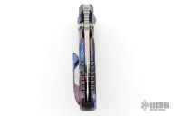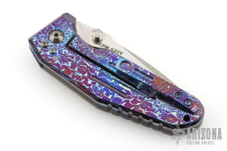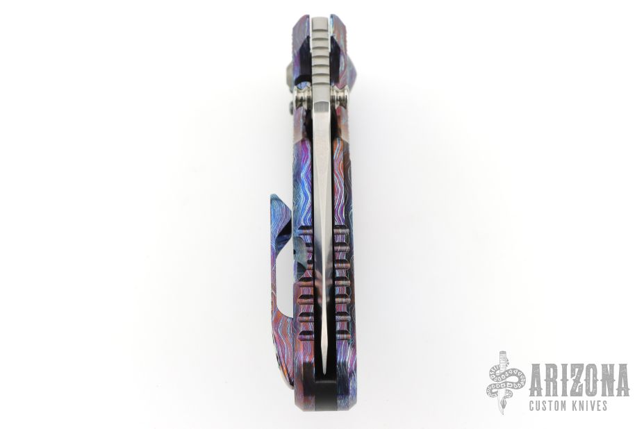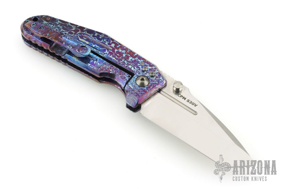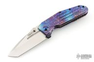 This Pocket Rocket by Shane Sibert features a satin finished tanto blade with dual thumbstuds, fullers, and a notched thumbrest. The handle has MokuTi scales, tip up or down reversible MokuTi clip with a carbon fiber backspacer, MokuTi inlaid pivot. Comes with a nylon zippered case. Nice detent, lockup and blade seating. Excellent condition.