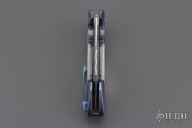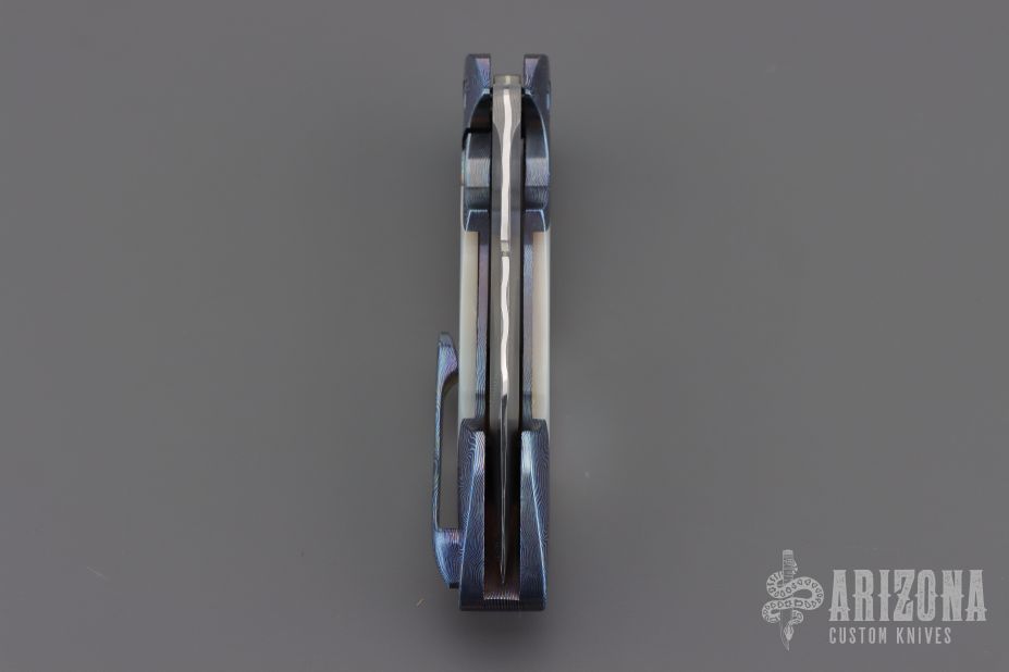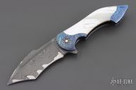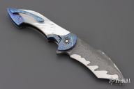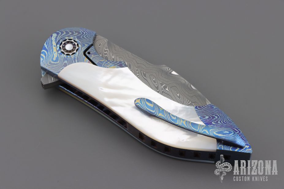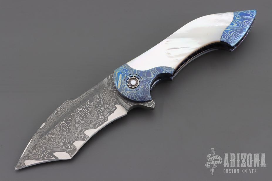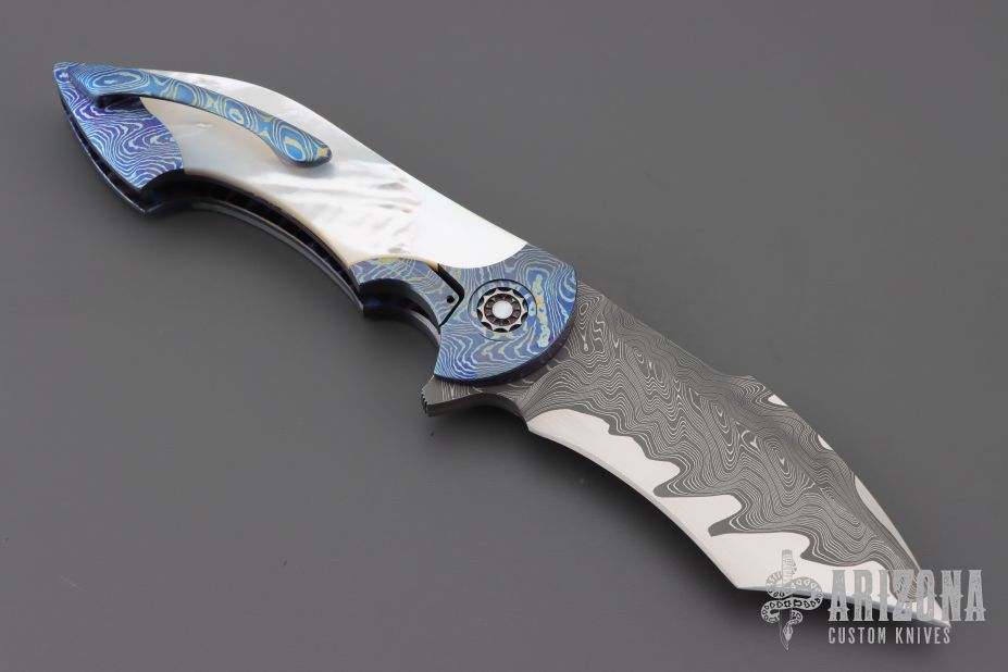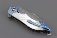 This Mini Battle Flipper by the Fischer Bros features a Chad Nichols San Mai Damascus tanto recurve blade with a false top edge and a notched flipper. The handle has Chad Nichols MokuTi bolsters with integral liners that have jeweled interiors, mother of pearl scales with hidden hardware, mother of pearl inlaid custom pivot with MokuTi pivot collars, MokuTi tip up clip with hidden screws and notched backspacer. Nice detent, lockup, action and blade seating, rides on bearings. Excellent condition. Comes with a zippered case.
