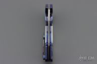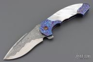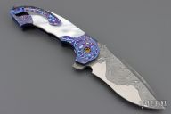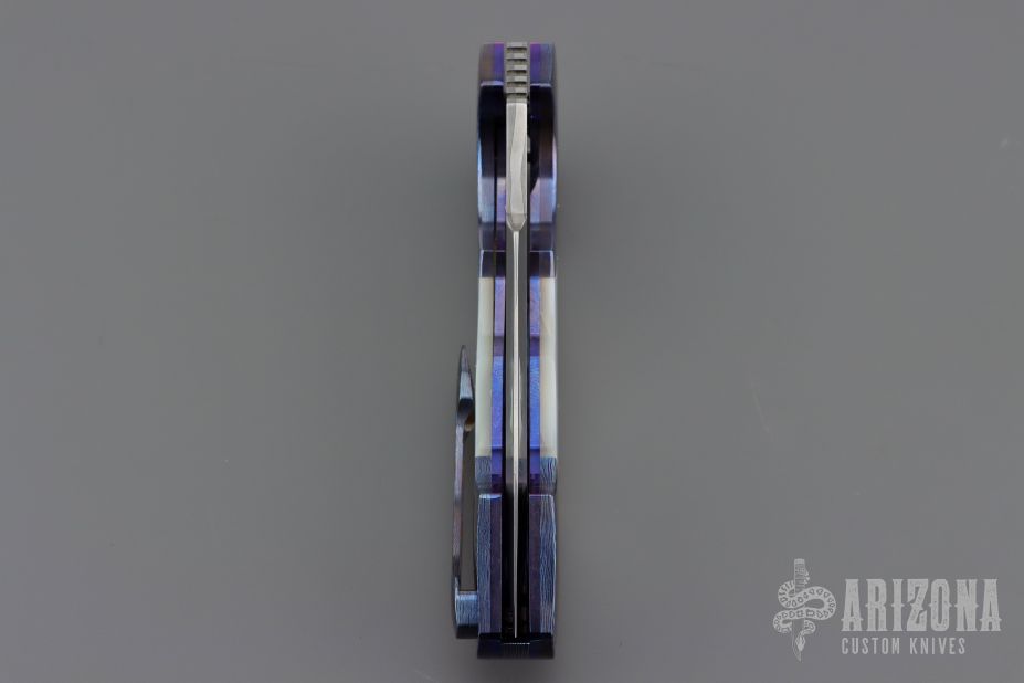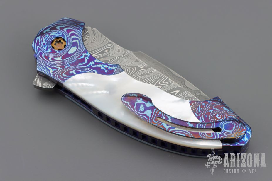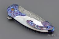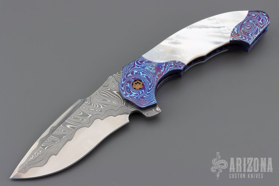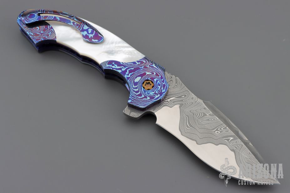 This gorgeous Archangel from Mr. Fischer features a Chad Nichols San Mai Damascus blade with false top edge, notched thumbrest and flipper. The handle has a Chad Nichols Wavepool MokuTi bolsters, anodized titanium liners with jeweled interiors, mother-of-pearl scales, notched Mokuti backspacer, and a tip up Mokuti clip with hidden screws. There are no visible screws on this knife except for the pivot. Blade is centered when closed and locks up with no play. Nice crisp detent. Very smooth action thanks to Mr. Fischer's bearing system. Includes a padded zippered case.  Excellent condition.