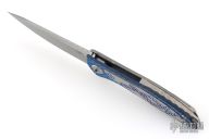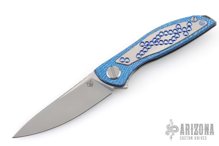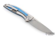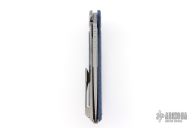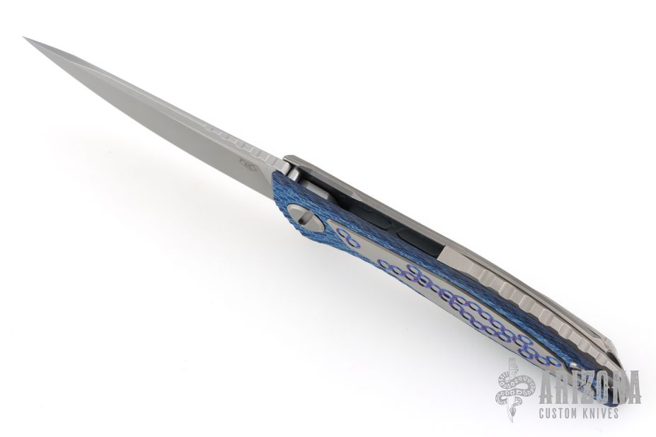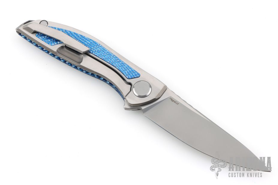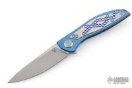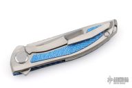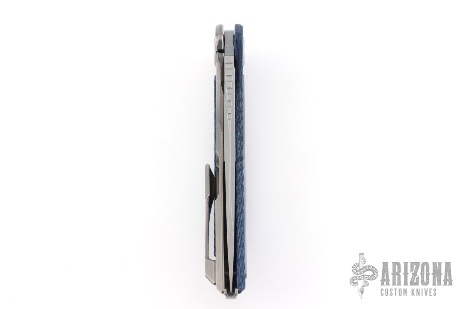 This Hati CGG is a collaboration between Chris Reeve Knives and Shirogorov Knives, notched thumbrest and flipper. The handle has an blue Alutex front scale with a titanium inlay with unique graphic, two-tone titanium lockside with blue Alutex inlay, matching tip up clip and backspacer with lanyard hole, stainless lockface insert. Rides on Roller Bearing System, nice detent, lockup and blade seating. Comes with original box and COA dated 2025. New condition.