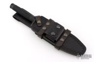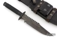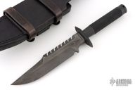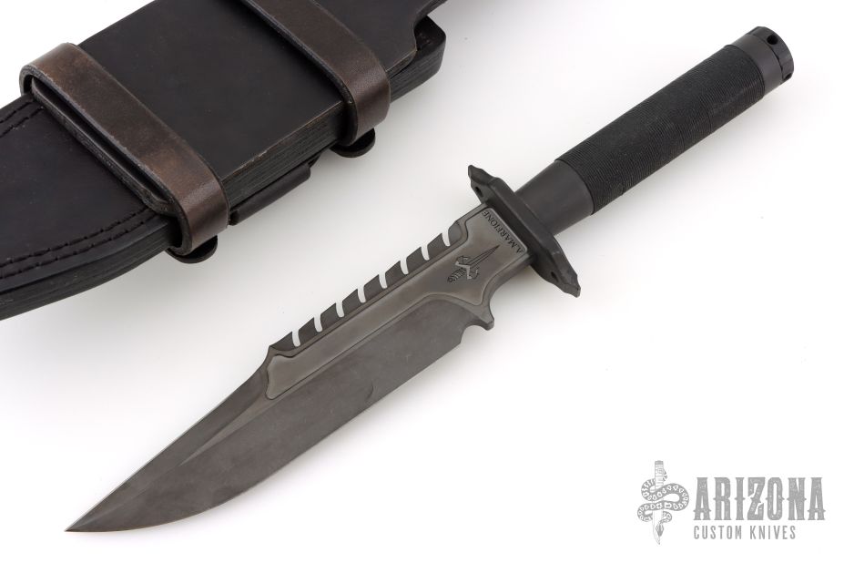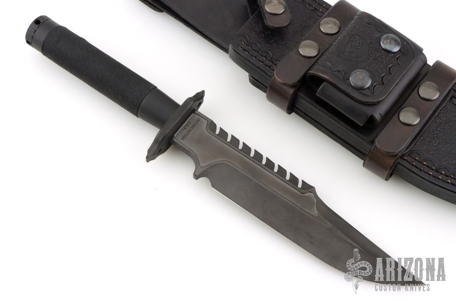 This Custom Interceptor by Marfione Custom Knives features a Two-Tone Apocalyptic DLC finished blade with sharpened clip point and sawteeth on blade spine, .250" blade stock and 1.687" blade depth, hidden tang construction. The handle, guard and butt are Apocalyptic DLC titanium with black Microcord wrap on the grip. Has compass inside butt cap and storage space inside handle. Comes with a black leather sheath by Ramos Leather. Comes with COA dated 12/2022. Excellent condition.