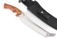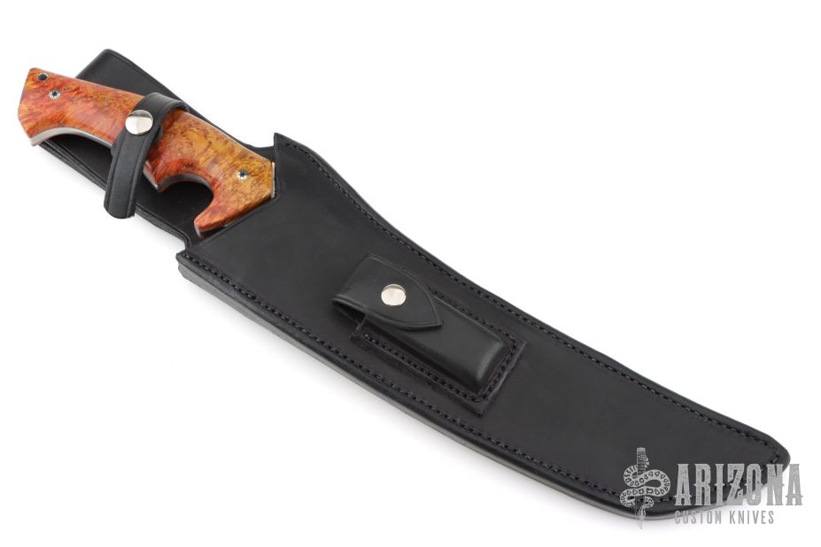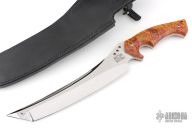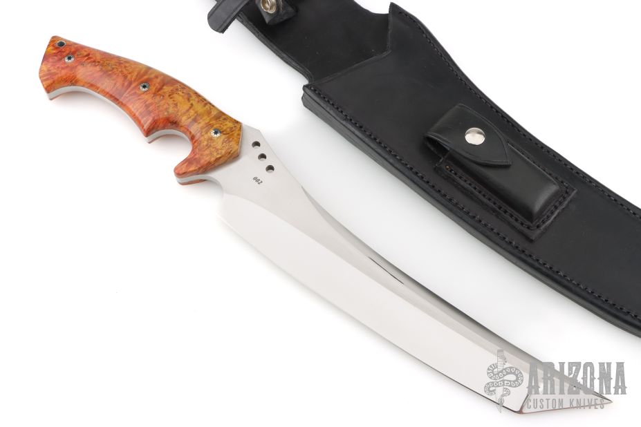 This 11" Custom Mamba Tanto by Walter Brend features a hollow ground mirror polished blade with satin finished flats, sharpened top edge, .256" blade thickness and 2.205" blade depth, full tang construction. The handle has beautiful dyed maple burl scales with mosaic pins. Includes a black leather sheath by Byrds Leather. Excellent condition.