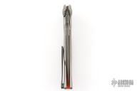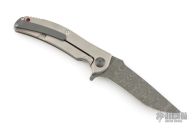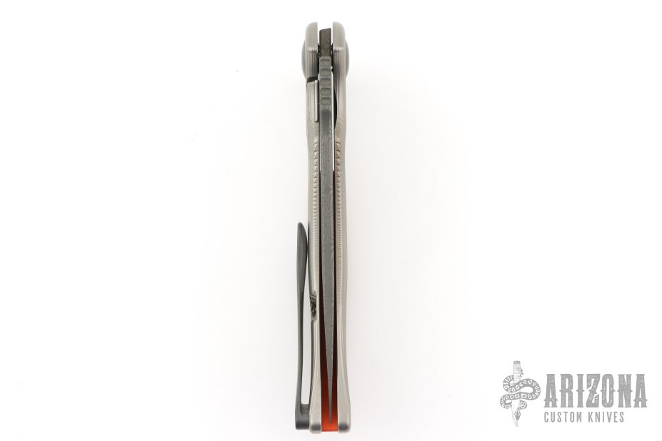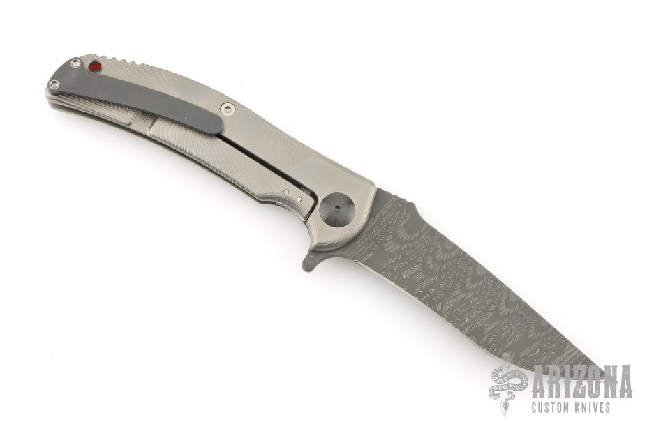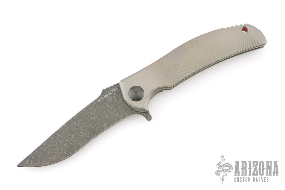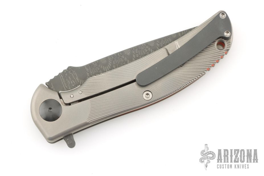 This "Q-36 SS" framelock flipper by RJ Martin features a Damascus blade with notched thumbrest and a flipper. The handle has a milled and blasted titanium frame, zirconium pivot and tip up clip, orange G-10 backspacer. Precision roller thrust bearings give the knife a very fast and smooth opening. Nice blade seating, detent and lockup. Excellent condition. Comes with zippered case.