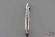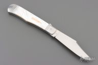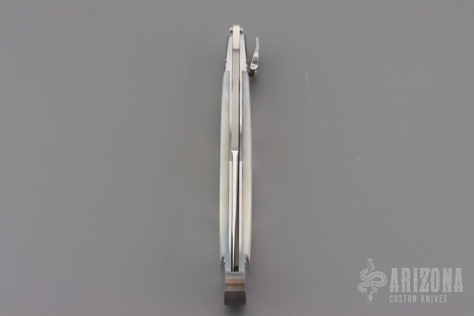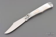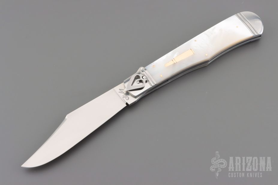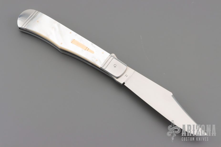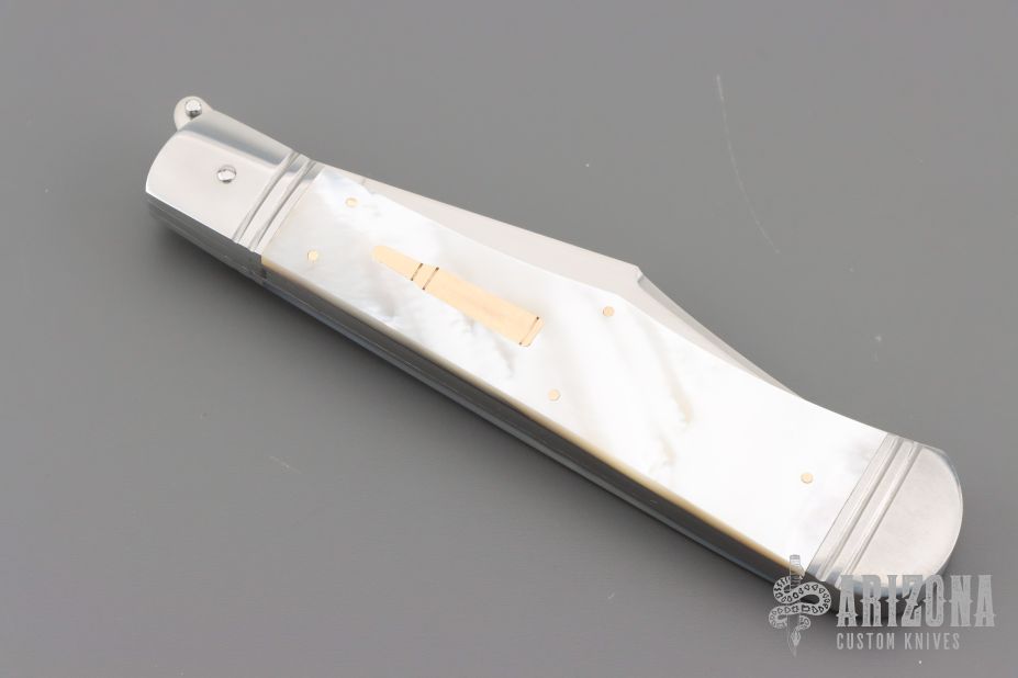 This One of a Kind Leverlock Auto by Eugene Shadley features a hand rub satin finished blade with false top edge. The handle has fluted stainless steel bolsters with integral liners, mother of pearl scales with gold pins and double gold bullet escutcheon, stainless steel spring. Has nice action, has some vertical blade play. #1356 on the blade and "1 of 1".  Has a small ding in the spine of the handle where the blade stops hit the frame. Otherwise excellent condition. Comes with a zippered case.