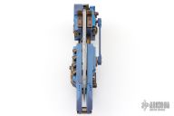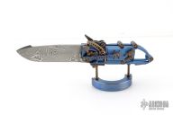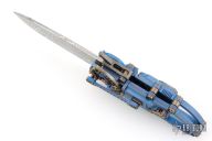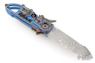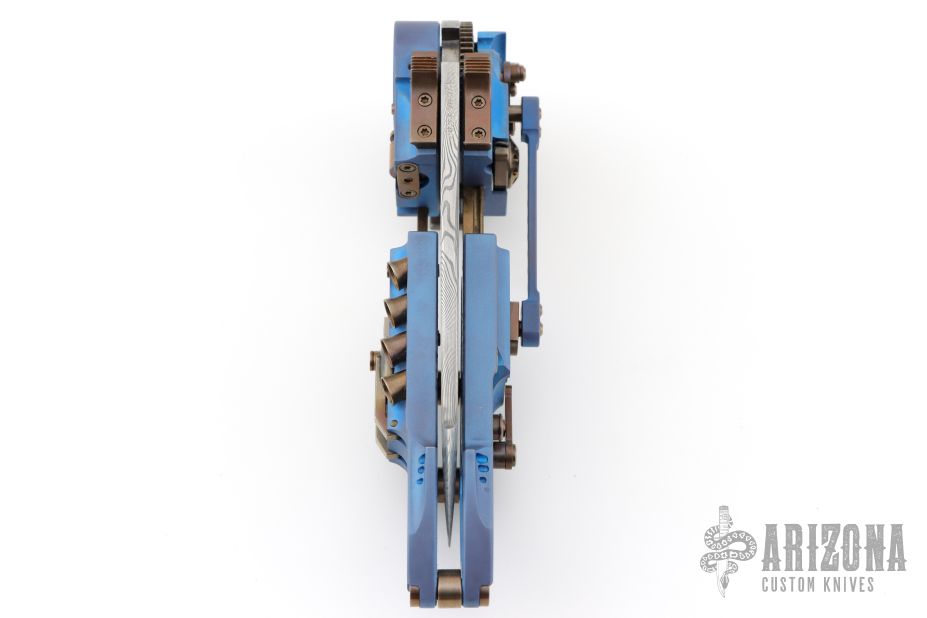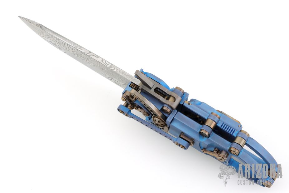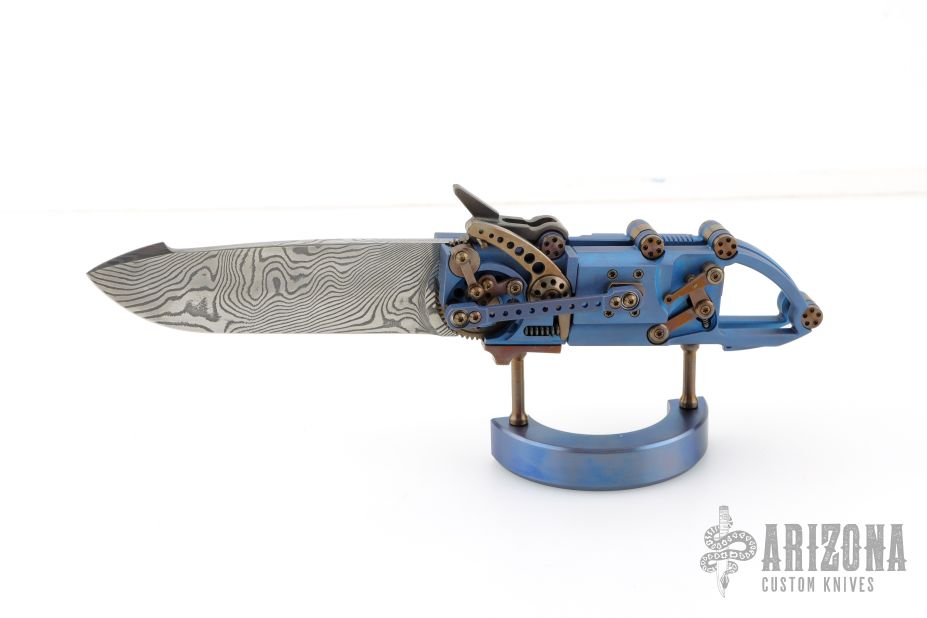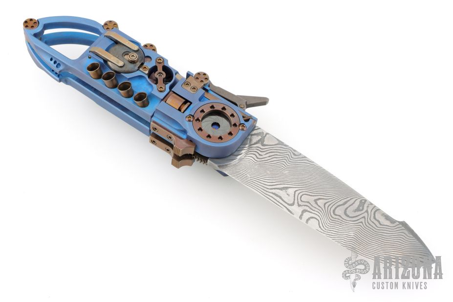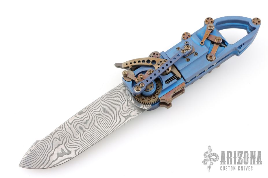 This "Steampunk" by Stefan Steigerwald features a Traditional Damascus blade. The handle has a blue anodized titanium frame, bronze anodized titanium accents and hardware, bronze stainless steel hardware pieces as well. There are gears and levers all over the place, and virtually everything moves while the knife is being opened and closed. Also the handle shrinks as the knife is opened, and lengthens as it is closed. It has decorative exhaust pipes, radiator fan, some timascus and Damascus accents as well. Comes with original box, COA dated May '22, and display stand. Excellent condition.