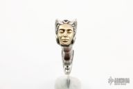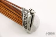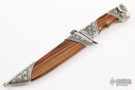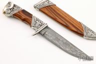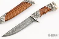 This "Golden Queen" by Aleksandr Flit a mosaic carbon nickel Damascus blade (Damascus by Matveev), it has the word "QUEEN" inside the Damascus pattern, .187" blade stock and 1.126" blade depth, hidden tang construction. The handle has 250 grams of sterling silver that is engraved and carved, King Wood grip, the butt has 14 grams of 14kt gold. The handle has two 3mm Diamonds and an amythest at the butt. The sheath is equally impressive sheath with engraved and carved sterling silver fittings and King wood. New from maker. Beautiful piece.